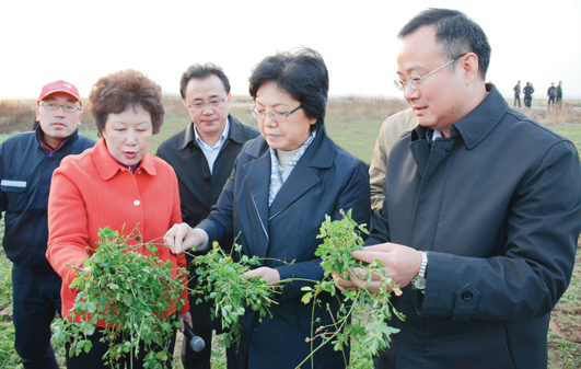 3日下午,李斌一行首先來到位于五河縣朱頂鎮(zhèn)的全國最大的紫花苜蓿生產(chǎn)基地——秋實草業(yè)有限公司調研。在市委書記周春雨、代市長白金明的陪同下,李斌深入田間察看牧草長勢,當她得知牧草品質上乘,草場機械化作業(yè)達到世界先進水平時,不住地點頭稱贊。調研中,李斌和在這里打工的女拖拉機手、朱頂鎮(zhèn)小柳村村民劉小紅拉起家常,希望她通過自己的努力過上更加幸福美好的生活。